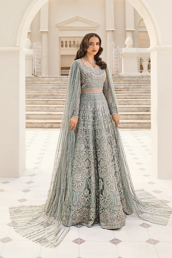 Richly crafted in traditional techniques, this mint green lehnga choli is the embodiment of utmost charm.