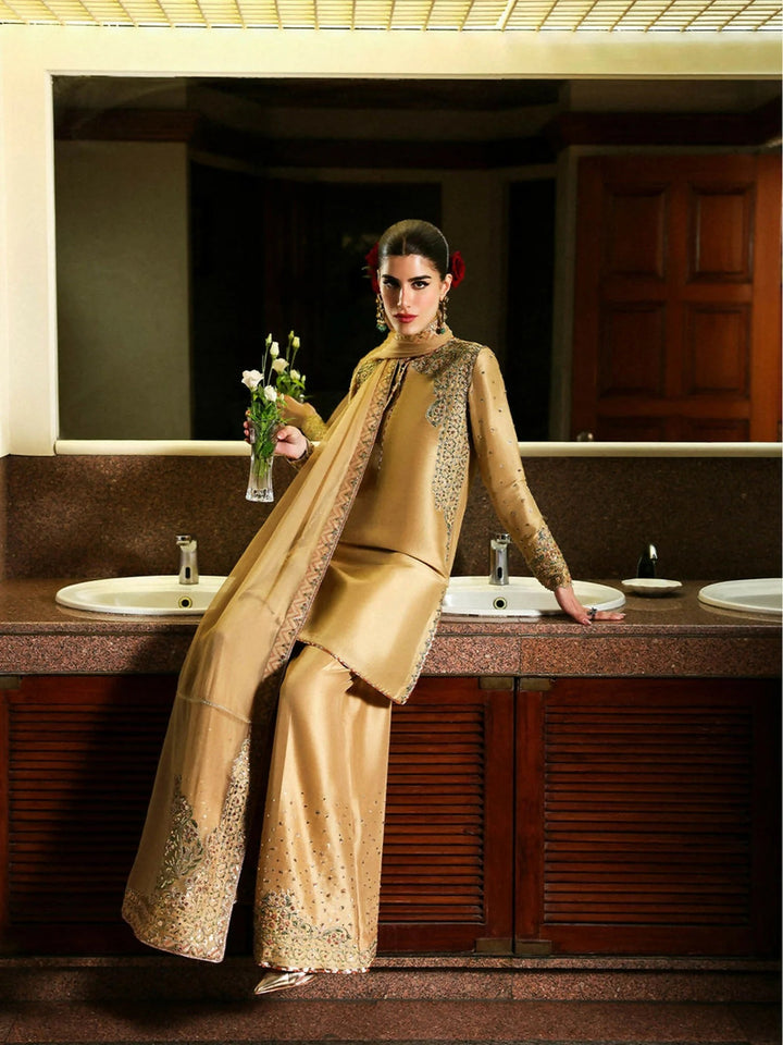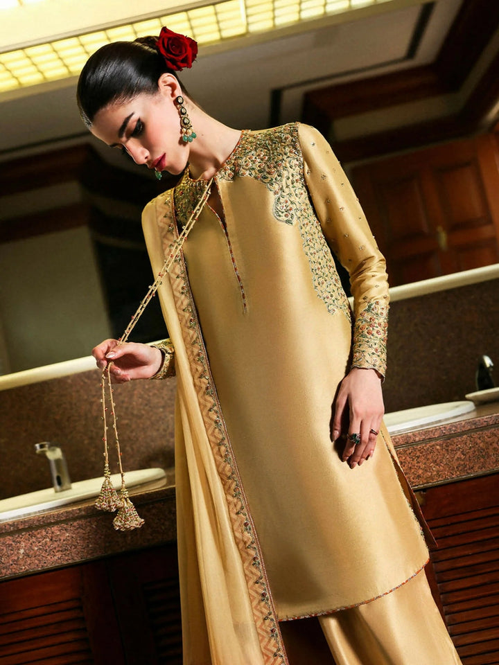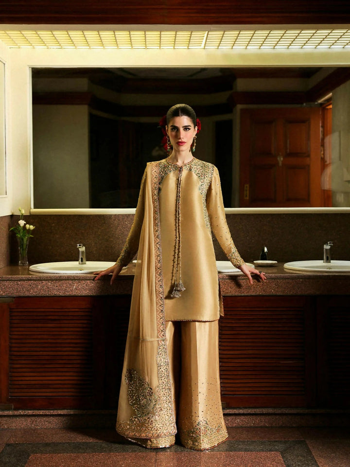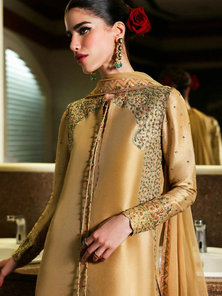 A striking gold raw silk outfit, exquisitely embroidered with floral motifs and elevated with delicate cutdana and sequin handwork. Rust chanderi silk trims and signature tassels create a bold contrast, while flared embroidered pants add grandeur to the silhouette. Completing the look is a sheer chiffon dupatta, finished with rust trims and gold satin patchwork corners for a refined festive appeal.