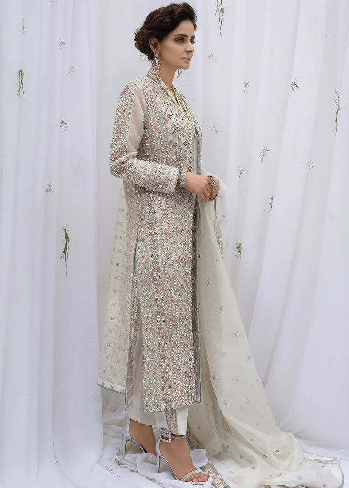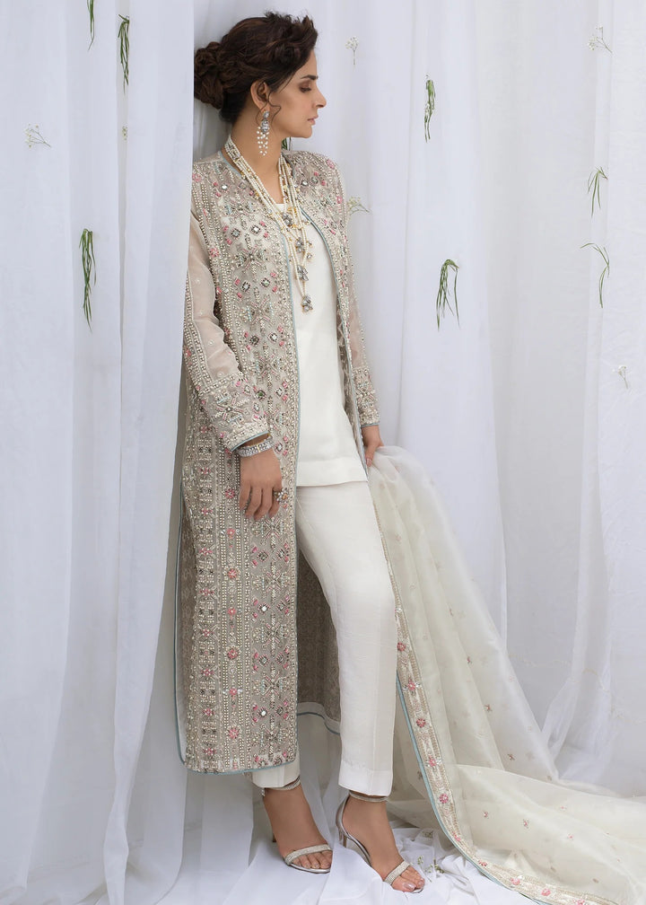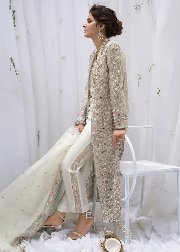 An open front, heavily embellished, floor length jacket sits above an ivory white slip and straight pants with an ice blue and candy pink embroidery panel running down the leg. The jacket is embossed with a geometrical design decorated with pearls, mirror work and hints of ice blue and candy pink seeping through intricate silver detailing. The garment is complimented with a white organza dupatta splattered with silver embroidery and an ice blue and candy pink border all around.