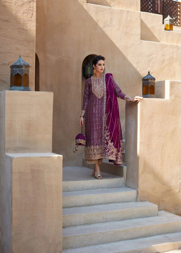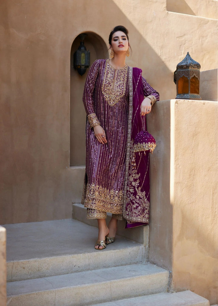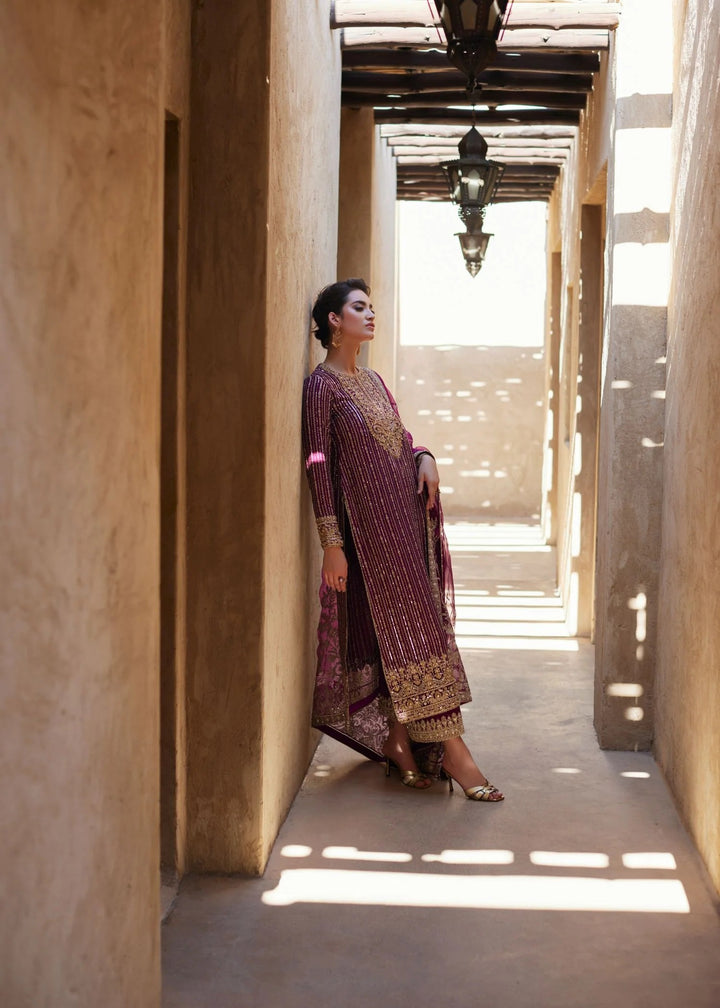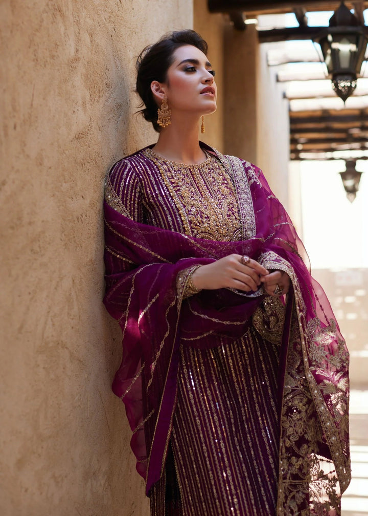 Amara is a stunning combination of modern sophistication and intricate artistry. This outfit features a long, straight-cut korean raw silk shirt, fully embroidered with dabka,kora pearls and crystals. Delicate details along the neckline and borders, adds an air of refined elegance. Paired with Korean rawsilk culottes, the ensemble offers a sleek, contemporary silhouette. Kathan organza dupatta completes the look with a mesmerizing spray of sequins that add a touch of sparkle and glamour. Amara is the perfect choice for those who appreciate effortless elegance with a hint of modern charm.