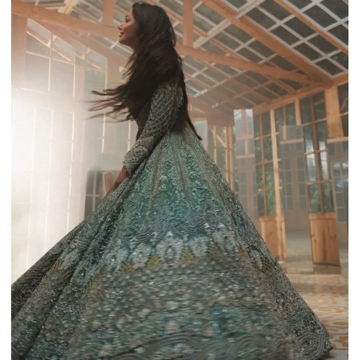 Completing the ensemble is a zari net dupatta in the same pewter blue hue, meticulously adorned with intricate borders and delicate sequins work. This addition adds a touch of celestial splendor to the entire attire, making it perfect for Pakistani designer lehenga choli enthusiasts seeking elegance and grace for their special day.