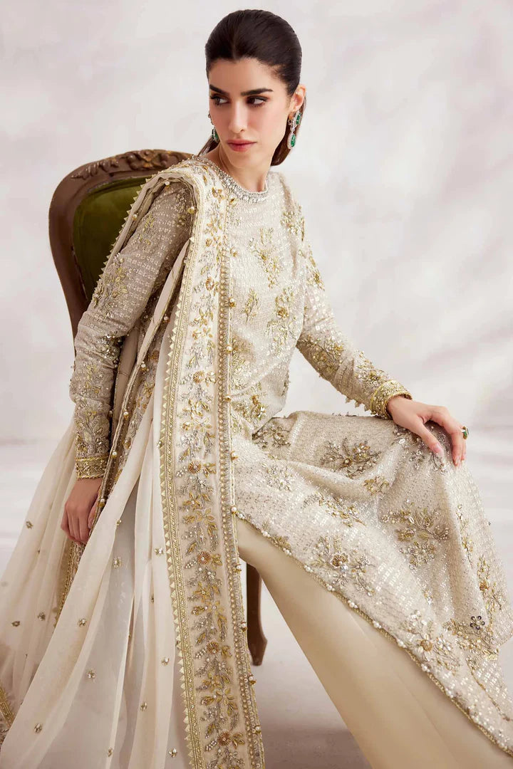 A luxurious three-piece outfit featuring a refined tailored shirt and chic cropped jacket lavishly adorned with obsidian crystals, cutwork, zardozi, and gotta embroidery. Paired with trousers highlighted by shimmering sequined borders and finished with an ornate organza dupatta, this ensemble radiates timeless elegance and royal charm.