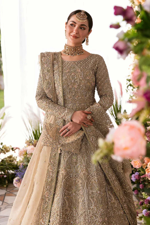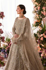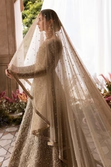 Paired with a self jamavar lehanga, with fully embellished exquisite border along with delicately paired with organza dupatta with four sided embellished border and extended pallu and booti spray. Moreover, a beautiful light champagne luxe net veil with pearls spray and four-sided intricate border has been added to give a goddess look to the outfit..