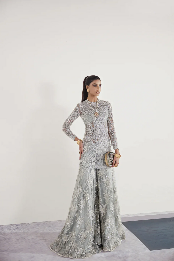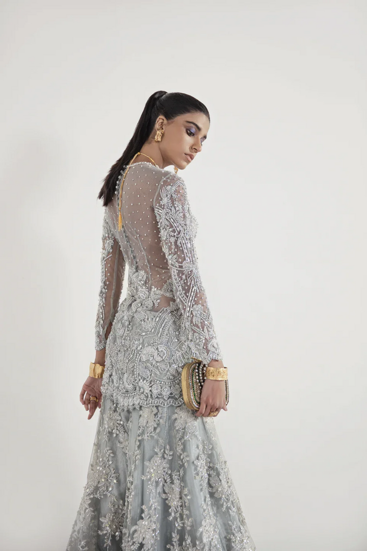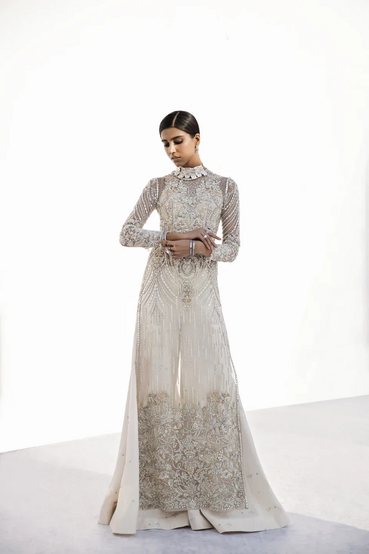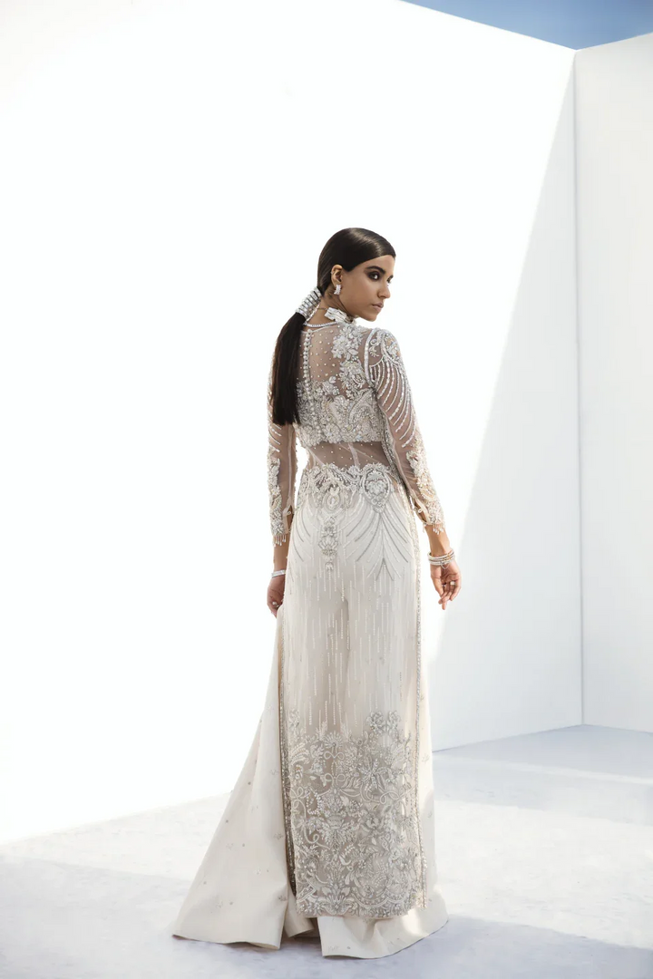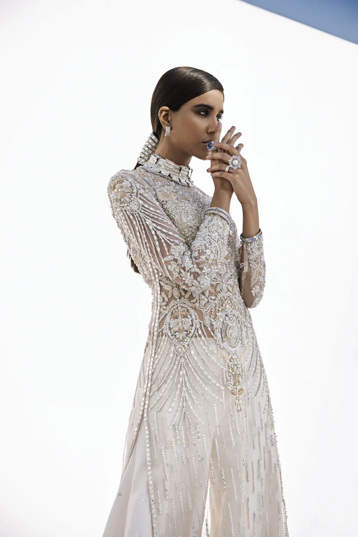 Anahita is a breathtaking ensemble that seamlessly blends regal grandeur with modern elegance. The intricate beaded work and shimmering sequins, meticulously placed in delicate patterns, envelop this breathtaking outfit. Featuring a contemporary, form-fitting silhouette with a high-neck design, it exudes sophistication. The gold and silver threadwork on the flowing pant-style lehenga completes the luxurious feel of this masterpiece.