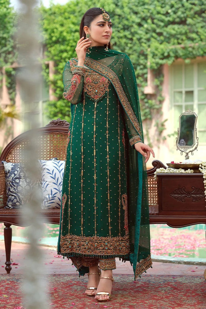 This ensemble featuring a deep green chiffon shirt, dupatta, and raw silk pants is a stylish and vibrant choice. It is designed in a traditional yet contemporary style. Dupatta has a beautiful border on all sides.