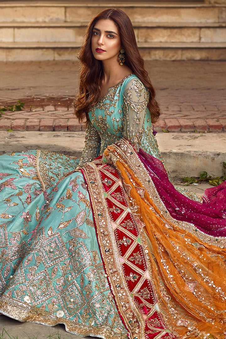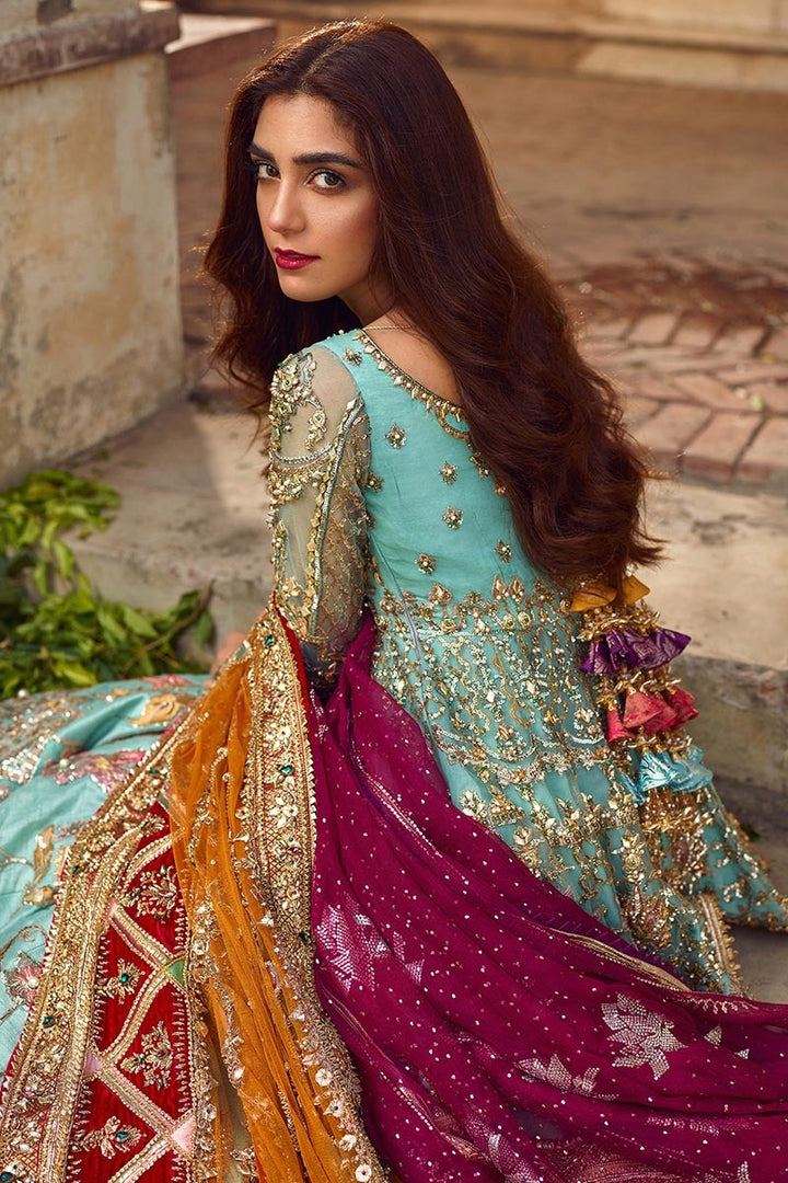 A4 piece bridal, Ronaq Jahan is a stunning sky blue lehnga decorated in hues of gold peach and green paired with a heavily embroidered peplum choli drenched in gota and zardozi color blocked with a heavy bordered mustard net dupatta doused in all hand embellished details of gota, sitari, tilla and resham and a plum organza dupatta with hand embellished kaamdani lotuses.